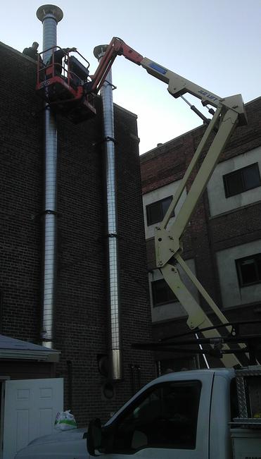 Installing tandem stainless steel stacks for the 2 Fulton vmp150hp boilers.